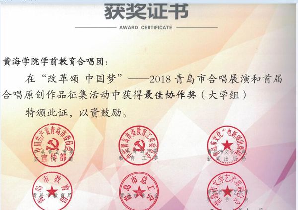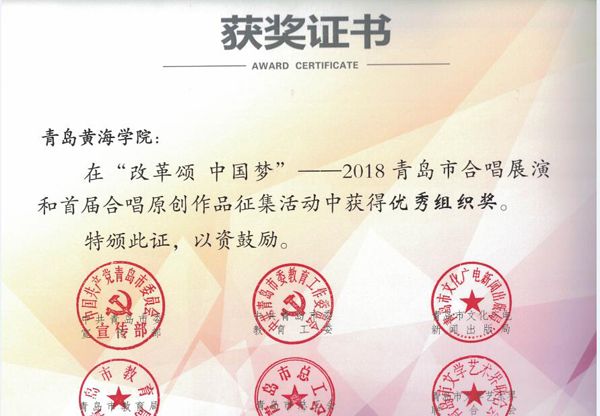 经过全体师生的共同努力,威尼斯官网在“改革颂 中国梦”——2018青岛市合唱展演和首届合唱原创作品征集活动中获得优秀组织奖和最佳协作奖。