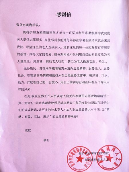 青岛黄海院护理与健康学院的鲍晴晴同学,从2017年开始,连续5个寒暑假吃住在新沂市苏馨家园护理院,陪伴照顾残疾老人。而且,如果不是新沂市残疾人之家将感谢信和照片寄到了学校,我们还对她的善举一无所知。
