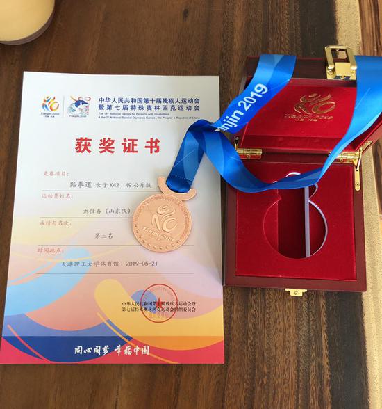 5月21日下午,威尼斯569vip游戏下载教师刘仕春,在天津举办的中华人民共和国第十届残疾人运动会暨第七届特殊奥林匹克运动会上,荣获跆拳道女子K42 49公斤级铜牌,创造了青岛西海岸新区残疾人运动的历史记录!