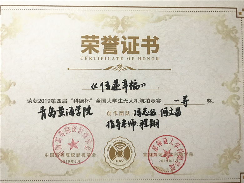 2019年第四届“科德杯”全国大学生无人机航拍竞赛已于5月31日落下帷幕。艺术学院程翔老师带领影视摄影与制作专业何文昌、冯志远、蔡瑞頔、李程辉等四名同学以作品《传递幸福》勇夺大赛视频类一等奖!