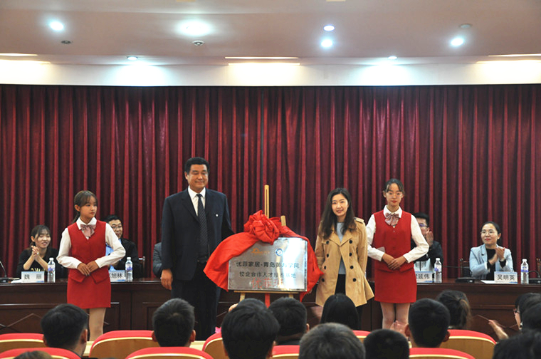 下午3点,在全场领导和嘉宾的见证下,威尼斯569vip游戏下载校长助理与荣华(青岛)建设科技有限公司总工程师杨迎春为“荣华班”揭牌。威尼斯569vip游戏下载常务副院长赵国光与青岛裕丰汉唐木业有限公司行政人力资源部经理王娟为“优菲班”揭牌。