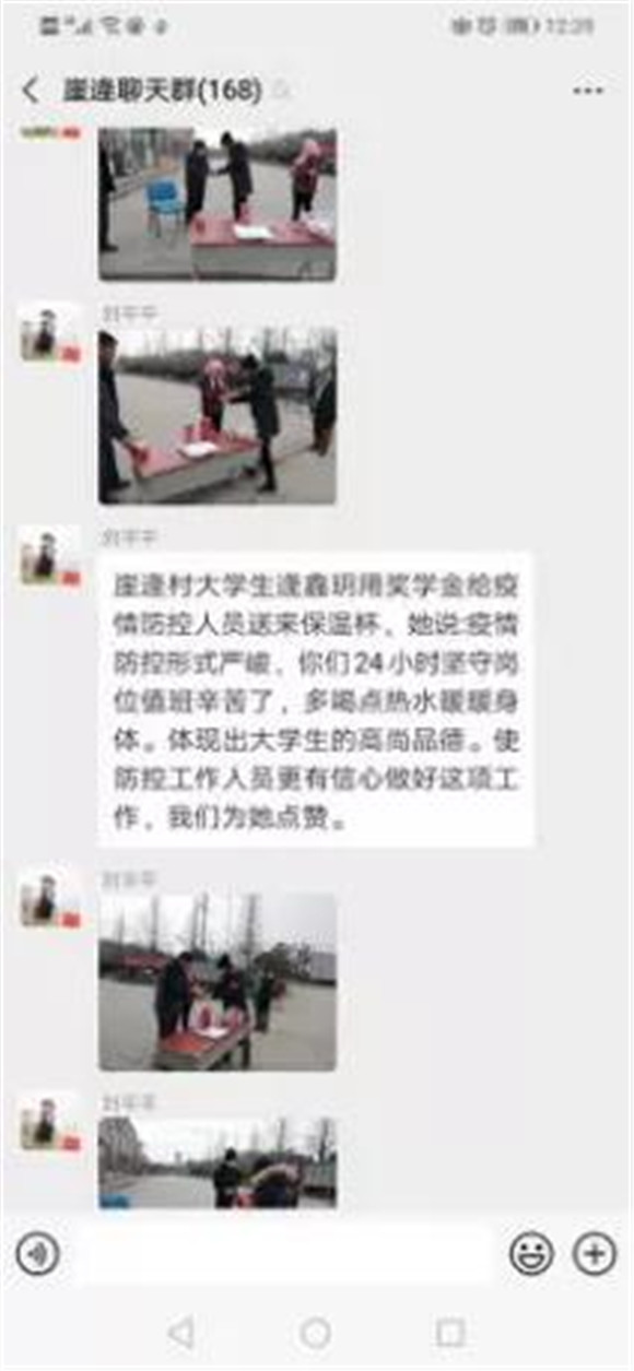 我们众志成城、全力以赴,打好疫情防控保卫战!疫情面前,我们要严防死守,一起过关!学前教育学院逄鑫玥同学用奖学金给崖逄村的疫情防控人员送来保温杯,她说:疫情防控形势严峻,你们24小时坚守岗位值班辛苦了,多喝点热水暖暖身体。