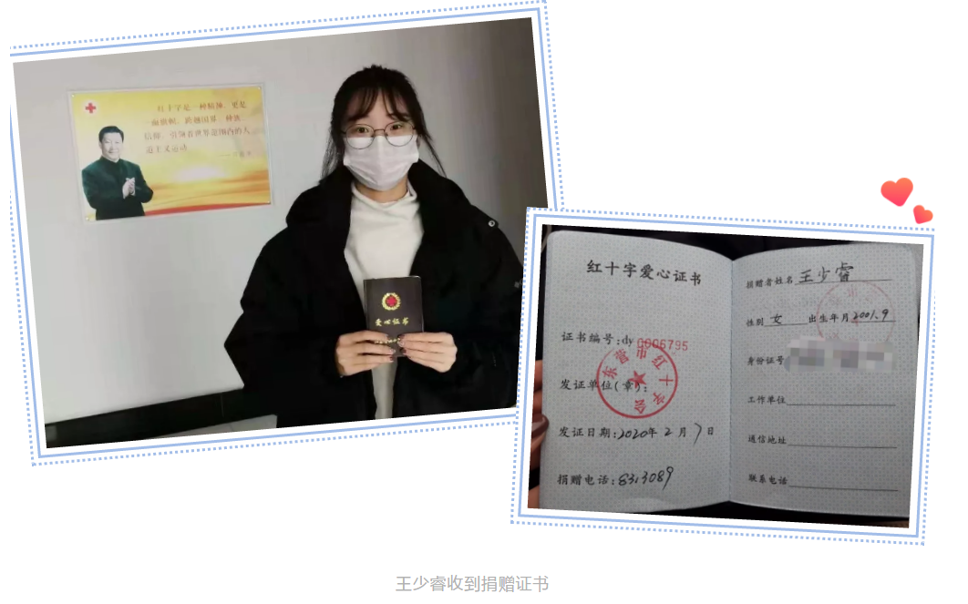 王少睿,家在山东东营。疫情爆发后,她每天关注关于疫情的各种新闻,看着确诊患者人数逐渐增加,她的心情也逐渐沉重起来。通过新闻,她发现防控最前线有越来越多的青年力量加入,许多青年志愿者奔波在战“疫”一线,共同抗击疫情。她想,自己一定要做点什么,要尽己所能为支援前线出一份力。于是,在家人的帮助和支持下,她在小区里做起了防疫志愿者,并联系到了山东省东营市红十字会,将筹备好的6020元钱于1月29日捐与疫情前线。这6020元钱,大部分是她平日里节省下来的,父母又给添了一些,可以说是王少睿全部的积蓄了。