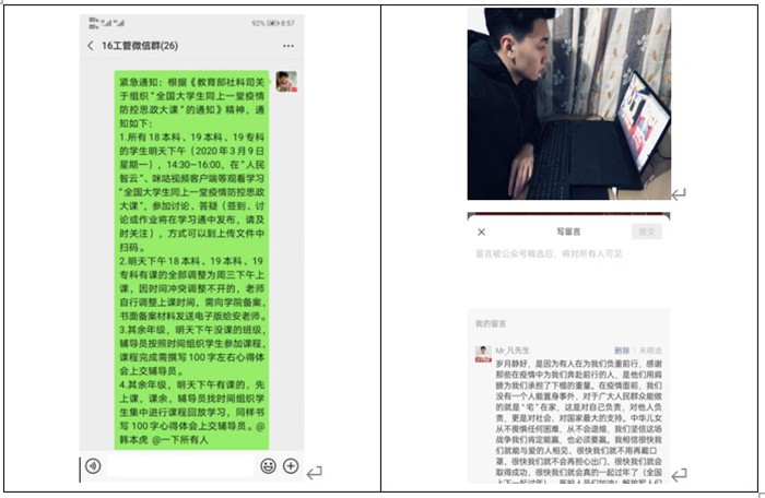 疫情期间,建筑工程学院甄选优秀爱国主义教育影片放映,结合我国防疫大局组织学生观看并创写优秀网文;班级辅导员建立宿舍长群,每天舍长汇报完美校园打卡情况,班长汇总,随时掌握每个班级每个同学的健康情况;采用钉钉、QQ等网络平台每周召开视频直播班会。停课不停思政,利用网络搭建平台,顺利开展思想教育工作,虽然不见面,却用一根网线连起与学生心的交流。组织学生在网络上观看