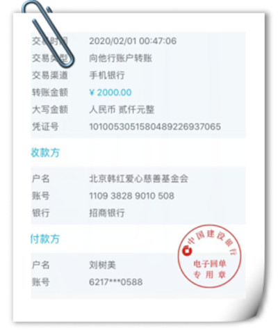 刘老师了解到,著名歌唱家、慈善家韩红老师一直致力于公益事业,自从疫情发生以来“韩红爱心驰援武汉”一直在行动,韩红老师以一个军人的担当与职责为武汉人民不断输送温暖,以实际行动在公益的道路上默默奉献。于是刘老师决定以个人名义通过“韩红爱心慈善基金会”向武汉疫区捐款2000元,为抗疫工作奉献自己的一份爱心。刘老师相信基金会一定能将她的爱心送到武汉,一定会把每一分钱用到最需要的地方。
