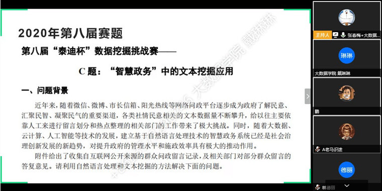 4月1日下午,大数据学院成功召开了关于“泰迪杯”数据挖掘竞赛和Mathorcup数学建模挑战赛介绍的会议。会议通过腾讯线上会议进行。大数据学院全体教师,2019、2018级部分学生参加会议,会议由张春梅老师主持。