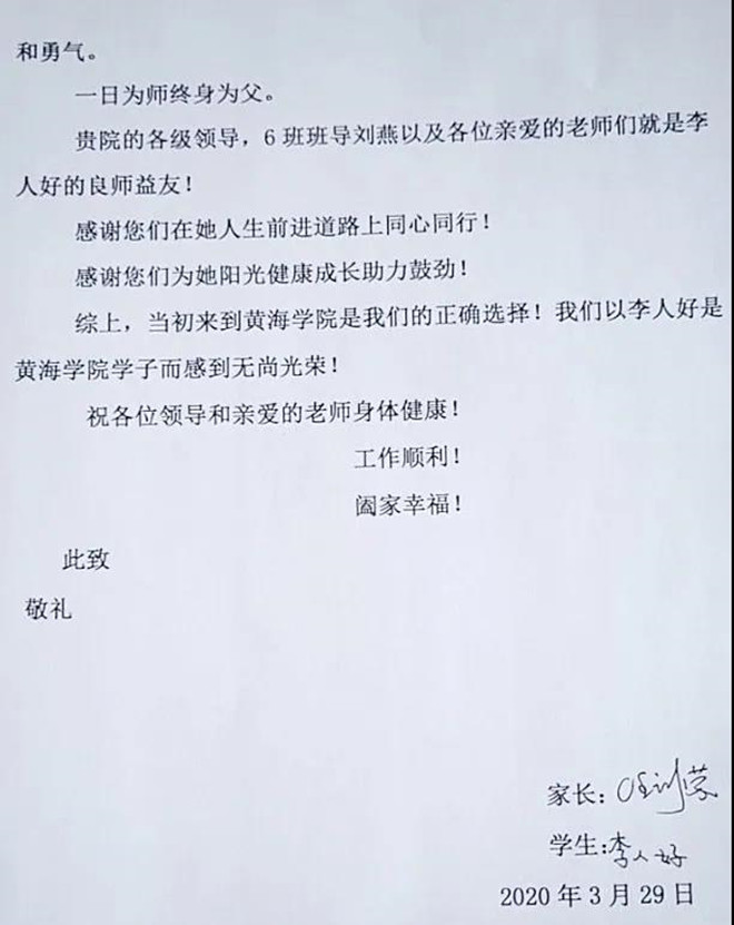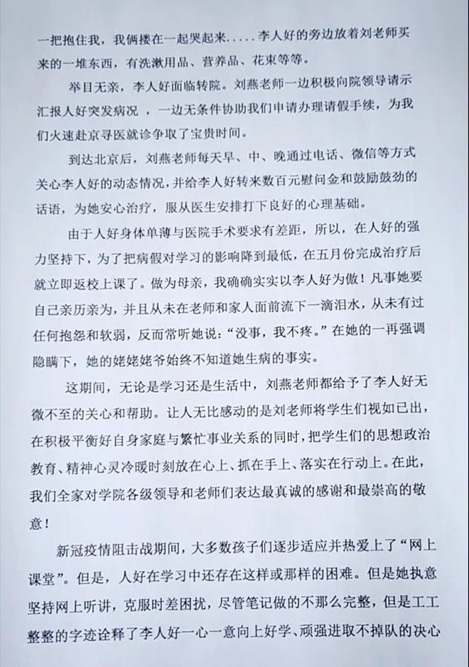 她要感谢的人是女儿李人好的辅导员刘燕老师,在李人好生病住院时,刘燕老师放弃休假陪护在侧,给了她母亲般的温暖。