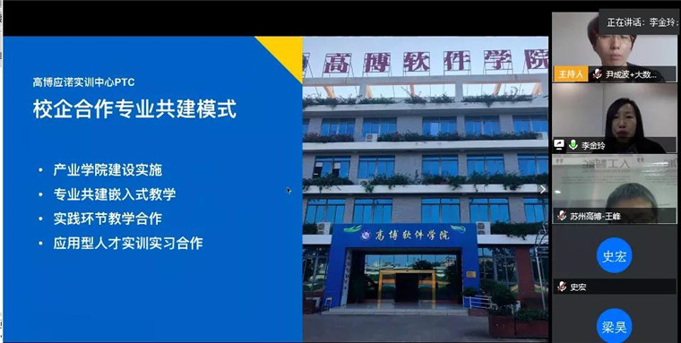 为响应教育部关于新工科建设与发展的号召,深入推进企业与高校协同创新,大数据学院积极申报2019年第二批教育部产学合作协同育人项目。本次与苏州高博应诺信息科技有限公司开展合作,从人才培养的新形势、新任务出发,聚焦产业发展前沿。4月23日14:30校企双方通过视频会议,针对教学内容和课程体系改革和实践条件与实践基地建设,两个项目合作协议签署事宜进行沟通。