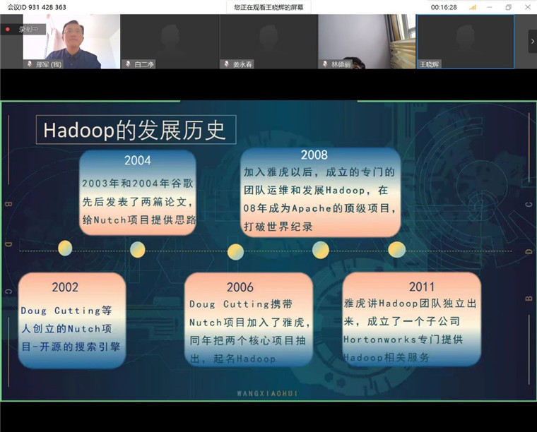 近日,王晓辉老师结合教学,以“大数据和Hadoop”为题分享了大数据技术架构及Hadoop编程相关理解,让大家对大数据技术现状及发展趋势有了清晰的了解。