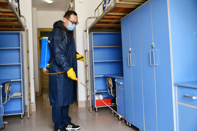 按照《威尼斯569vip游戏下载清洁消毒制度》要求,每天对宿舍等人员密集区每天消毒不少于2次。提醒学生消毒前保持宿舍清洁并关闭门窗。消毒时先对床扶手、橱柜门及把手采用擦拭的方式进行消毒,再用普通喷雾器喷洒消毒液的处理方式对地面由里向外消毒。最后用擦拭的方式对门及门把手等表面消毒。