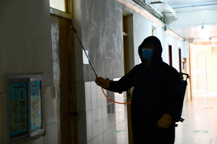 工作人员每天2次使用喷雾器对学生宿舍楼公共区域进行消毒。