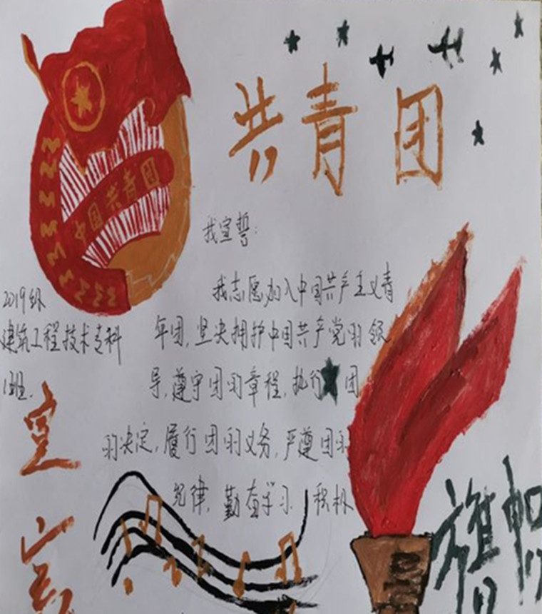 为了坚定团员理想信念,激发广大青年团员的自豪感、责任感和使命感,让同学们牢记入团誓言,建筑工程学院于2020年5月1日至5月5日举行了重温入团誓词活动。活动下发至每个团支部后,广大团员以各种形式积极参加活动:绘制手抄报,手抄入团誓词和班级线上誓词接力等。