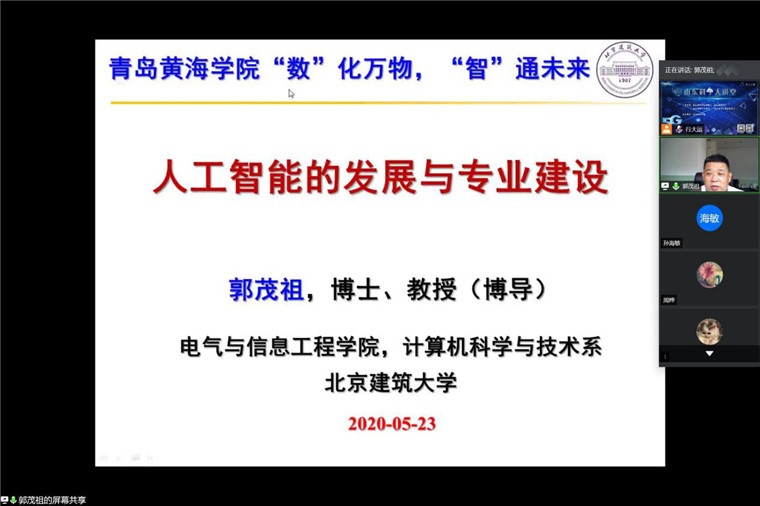 讲座环节分别由郭茂祖教授、尹成波副院长、姜斌斌经理、王艾军总监作相关主题分享。郭茂祖教授做了题为《人工智能的发展与专业建设》的报告,对人工智能发展的历史沿革和前沿现状进行了介绍,并对比分析了北京建筑大学等几所高校的人工智能专业建设情况和人才培养方案设置情况,指出了人工智能专业发展的方向。