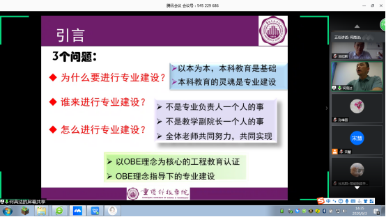 为持续推进威尼斯官网工程教育专业认证工作,不断开展符合工程教育专业认证的专业建设,系统构建和完善面向产出的应用型本科人才培养模式、课程体系及持续改进机制,使广大教师充分理解 OBE教育理念,为今后的工程教育专业认证奠定基础,6月3日下午,智能制造学院组织召开第2期工程教育论坛,特邀重庆科技学院何高法教授,面向全校教师作题为"基于OBE教育理念的专业建设"专题讲座。智能制造学院院长刘纪新、教学副院长曹爱霞及学校部分骨干教师通过腾讯会议共同聆听了本次报告,报告由刘纪新院长主持。