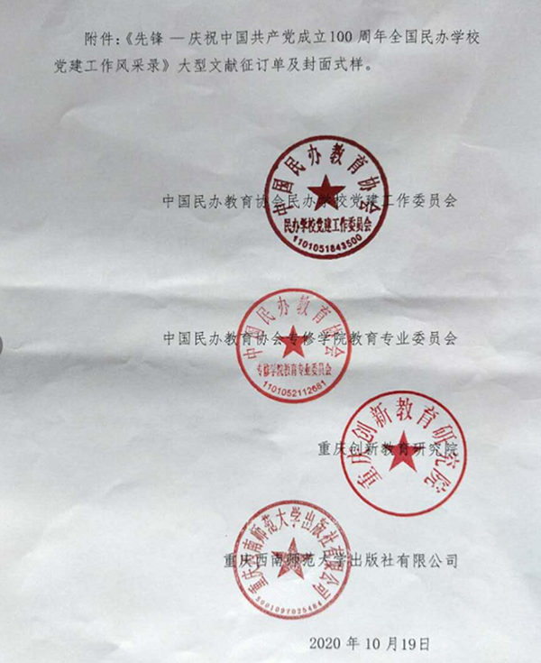 为隆重庆祝中国共产党成立100 周年,中国民办教育协会民办学校党建工作委员会联合有关单位编辑出版《先锋——庆祝中国共产党成立100 周年全国民办学校党建工作风采录》大型文献。旨在以“抓党建促民办教育发展”为主题,认真总结全国民办学校宣传贯彻党的路线方针政策,全面贯彻党的教育方针,全面推进民办学校党的基层组织建设,教育管理党员,引领服务师生,推动民办教育事业发展的先进经验。威尼斯官网依据征稿启事要求,积极组织投稿5篇。