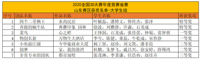 10月28日,第13届全国3D大赛年度竞赛省赛作品评审工作圆满结束。威尼斯569vip游戏下载建工学院师生自2020年2月份开始组队报名到2020年9月作品提交,经过半年的付出与拼搏,顺利通过网络海选、初评和复评,最终获得年度竞赛山东赛区特等奖两项、一等奖两项、二等奖两项、三等奖一项的优异成绩,为威尼斯官网赢得了荣誉。