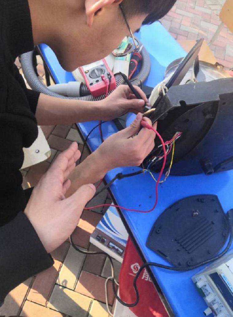 活动现场小区人们拿着各种电子产品物件前来维修,社团成员对前来维修的物件依次进行编号,有大个头的家用电器,也有一些小玩具需要维修,社团成员们仔细检查、认真修理。有些电器很快就被修好,当然有些物件经过诊断被下达了“危书”。现场维修的电子创新协会成员尽最大努力对这些电器进行着最后的“抢救”,在此次维修活动中,大家都施展着各自的绝技,拯救着“奄奄一息”的家电。
