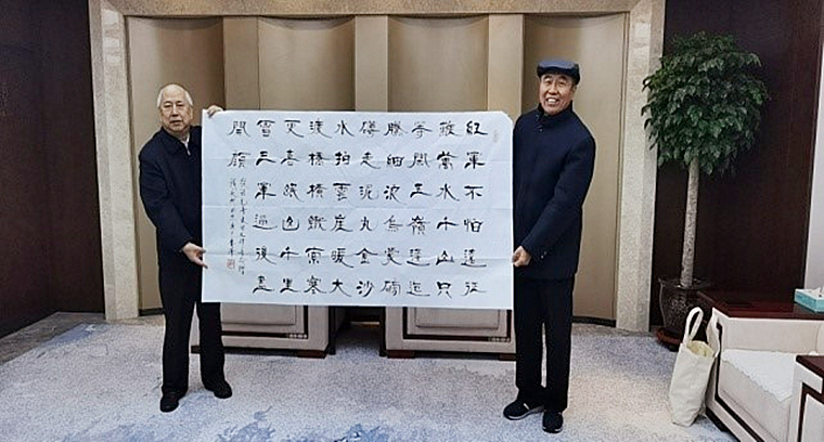 会议期间,宋庆泽主任一行拜会了钱永刚教授,向钱教授当面汇报了学校申建钱学森班(学院)的总体构想和前期工作,钱教授给予了充分肯定。宋主任将专门为钱教授精心创作的大幅六尺隶书毛主席诗《七律.长征》书法作品赠送给钱教授并合影留念。