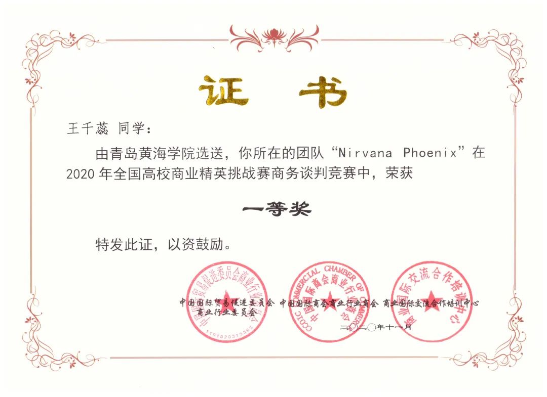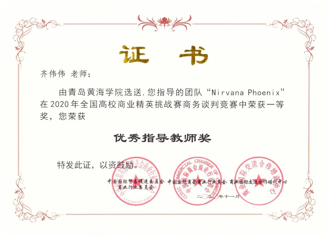 由于疫情原因,2020年度总决赛由现场赛更改为线上举行,比赛双方以及评委通过腾讯会议完成竞赛并进行评分。团队在备赛的过程中,齐伟伟老师负责谈判整体指导,针对谈判礼仪、磋商技巧、策略使用等多个细节进行仔细打磨。冯雪洁老师负责双语指导,针对英文合同条款及报价单中的突破口进行捕捉。团队成员尽最大的努力寻找谈判环境和路演设备,力争还原最真实的谈判环境。经过线上抽签,确定对手为中南财经政法大学。经过两小时的激烈角逐,在全体成员共同努力下,威尼斯官网学子最终取得了全国一等奖的好成绩。齐伟伟老师、冯雪洁老师均获得优秀指导教师的荣誉称号。