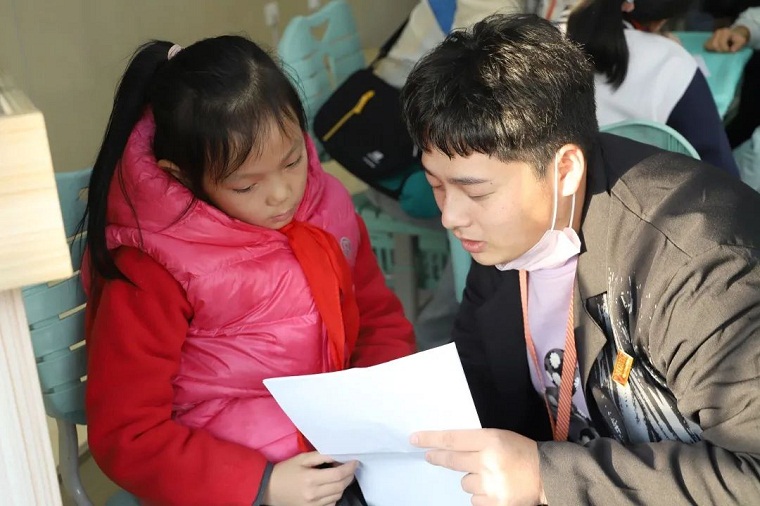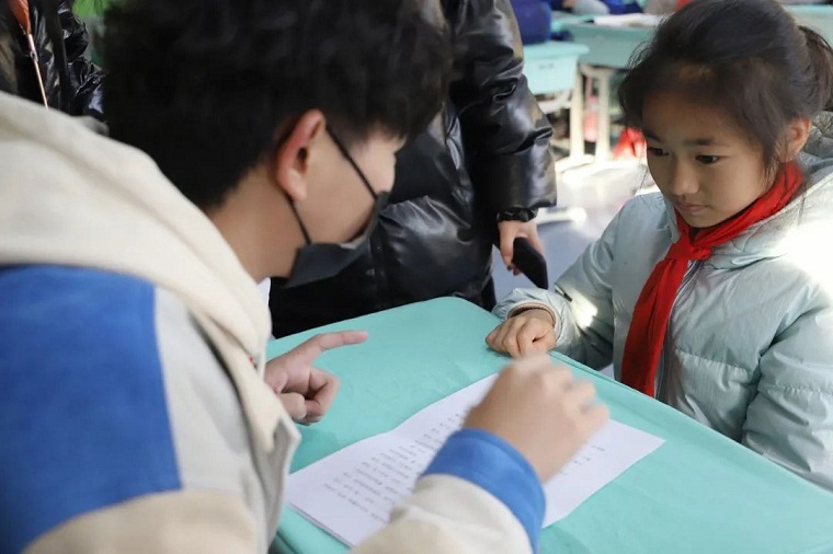 此次志愿活动的核心就是为青岛西海岸新区朝阳小学的同学们当一次志愿助教。艺术学院的志愿者们也充当了一次“小老师”。他们仔细询问了小同学们卷子上出现的错误,为他们仔细讲解了出错的题目,开展一对一教学。