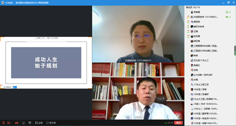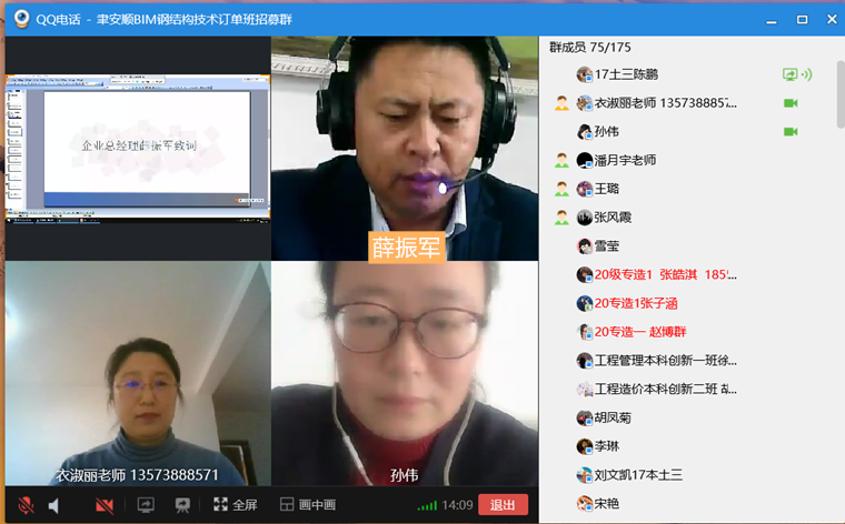 为了紧跟行业技术发展趋势,深化校企合作,为我院师生创造更广阔的实践平台,为企业及社会提供更多优质的BIM人才资源,建筑工程院BIM产学研中心联合青岛聿安顺工程管理有限公司于2021年1月25日上午10:00线上举行了BIM钢结构深化设计订单班(二期)开班仪式。建筑工程学院院长助理孙伟、青岛聿安顺工程管理有限公司总经理薛振军、大学生创就业教育专家教授李春景、一期学员代表刘文凯、陈鹏、杨工贤以及BIM产学研中心及钢结构技术订单班的全体师生参加开班仪式,开班仪式由BIM产学研中心负责人衣淑丽老师主持。