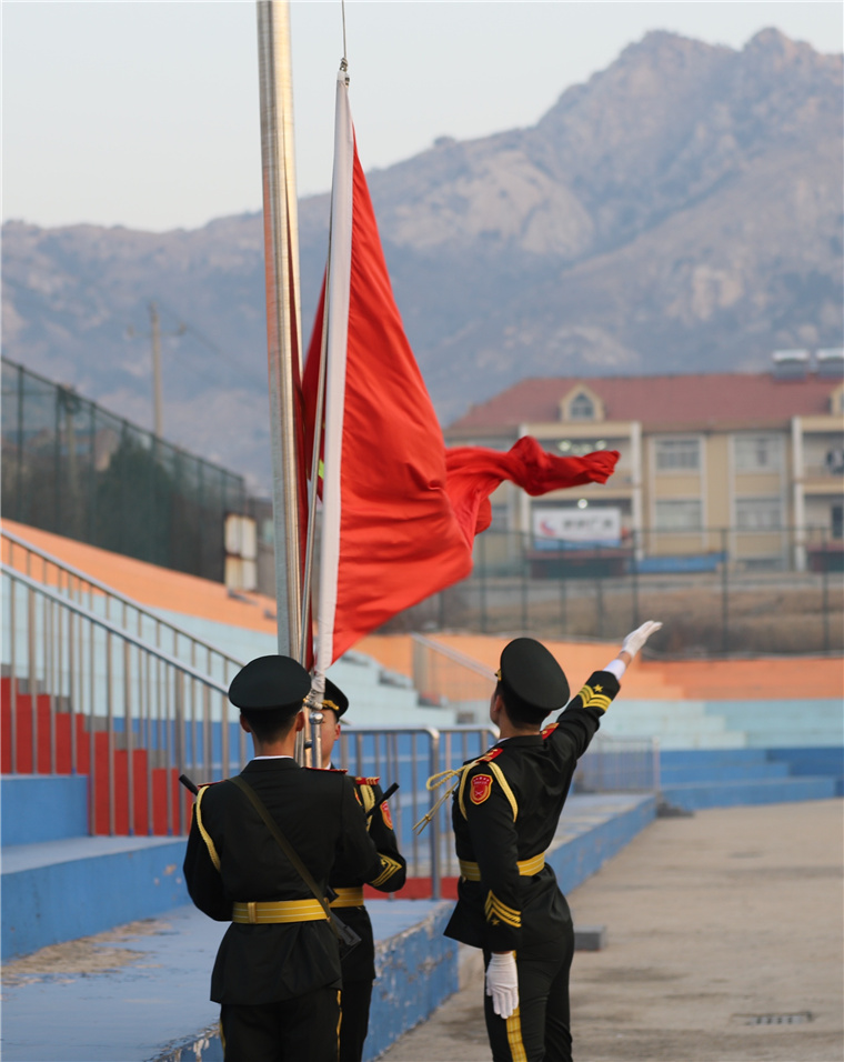 升旗仪式上,英姿飒爽的国旗护卫队队员们迈着坚定统一的步伐护送国旗进场。伴随着庄严的国歌,升旗手振臂一挥,五星红旗冉冉升起,在晨曦中迎风飘扬在黄海的上空。在场师生用嘹亮的歌声表达对于祖国深厚的情感和崇高的敬意。