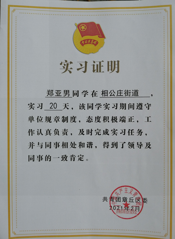 走出课堂,实习操作,践行“知行合一”的校训,了解课本上与学校之外的知识与经验,青鸟计划为青年学子提供就业实践的平台。在2020年度,正值疫情防控的关键时期,郑亚男响应“青春山东”发出的号召,利用“青鸟计划”平台报名,参与山东站“疫”行动志愿者,借助新媒体平台推送、转发宣传有关于疫情的新闻。这个寒假,通过共青团章丘区委的推荐,回到“青鸟计划”的平台,有幸成为地方政府服务大厅的一员,在这次实践过程中,她第一次体会到基层公务人员的生活,在政务大厅,除了参与解决平时的民生服务问题,还主要负责春运外地返乡人员的统计工作,积极完成街道办的每天汇报工作。事情虽琐碎但绝不冗杂,郑亚男同学深刻体会到政府“从群众中来,到群众中去”的基层办公理念,与此同时,也更加深刻的明白老师为什么教导同学们要养成吃苦耐劳的精神。