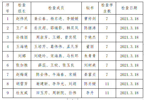 为使毕业设计(论文)的质量得到保证,过程得到有效监督,智能制造学院制定了本科生毕业设计(论文)检查方案。根据检查方案,智能制造学院3月18日下午进行了2021届毕业设计(论文)首次阶段性检查。根据每位指导教师至少有一名学生被抽查的原则,本次检查共抽到了71名学生。由于涉及的学生人数和专业较多,本次检查共分九组进行,参与检查的指导教师有45名,首次检查安排表如下表所示。