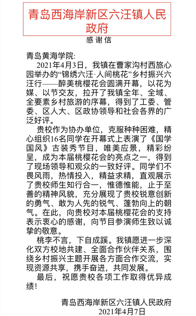 演出当天,桃樱花会恰逢春雨朦胧,同学们不畏风雨,热情投入,克服种种困难参与到本次演出中,得到了主办方及广大观众广泛好评。六汪镇人民政府发来感谢信,各大媒体对本次演出活动进行了报道。