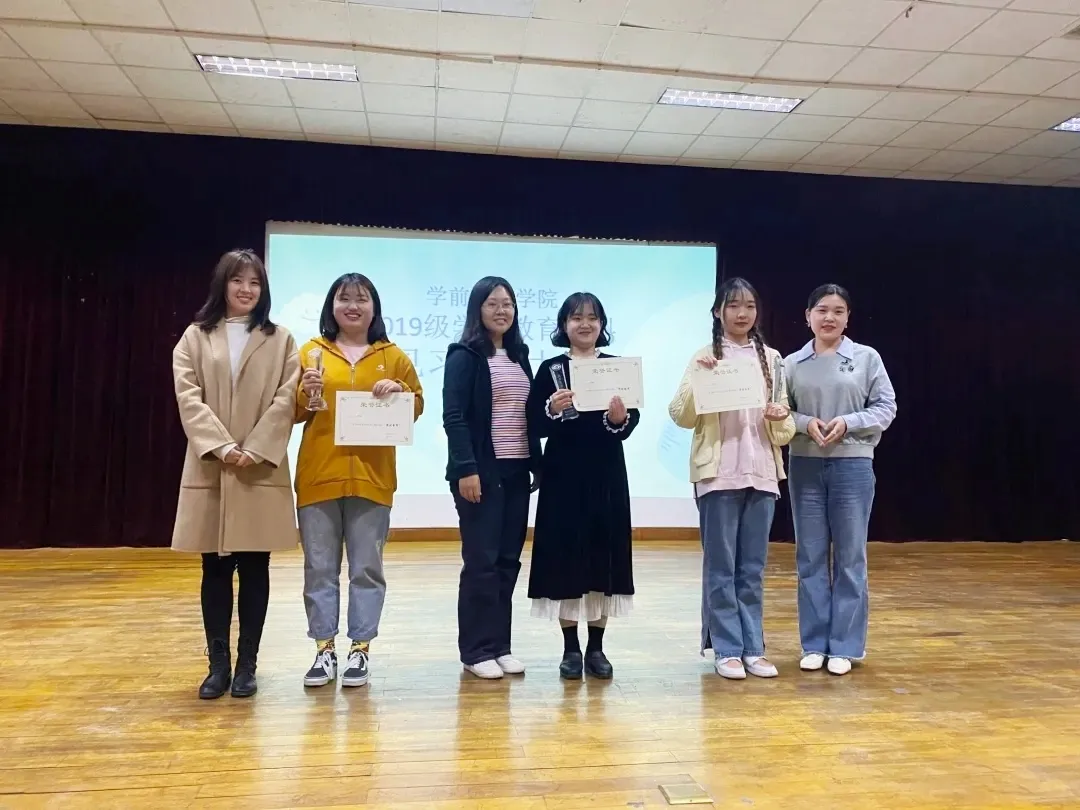 见习分享完毕后,见习带队老师顾娟对本次实习以及分享大赛进行总结。她先对实习的总体情况进行了介绍,她从课堂流程、环节、教态、基本素养等方面肯定了同学们的成绩,同时提醒同学们,树高千尺,营养还在根部,要求同学们打牢基础,总结经验,寻找差距,弥补不足,希望同学们能将实践与理论相结合,为将来的职业做好规划。老师总结完后,主持人宣布了获奖名单,评委老师给获奖选手颁奖并进行了合影留念。获奖名单:第一名是2019级学前教育本科2班许硕,第二名是2019级学前教育本科1班贺颖健,第三名是2019级学前教育本科4班冯俊科;优秀奖:王雨淳、刘宝怡、刘明杰、陈琳。