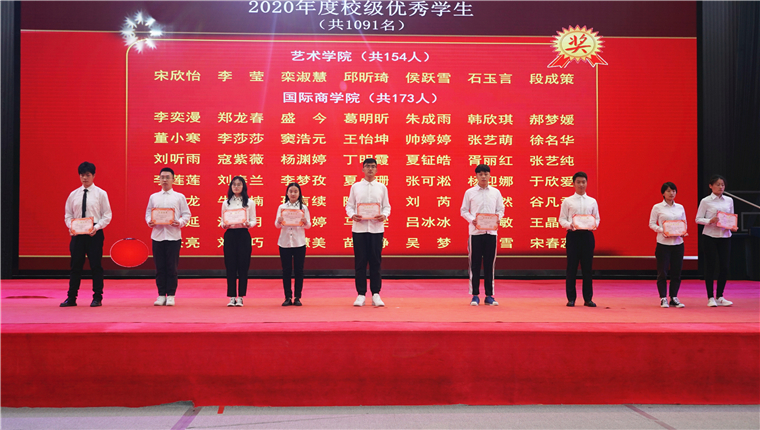 会上对护理与健康学院、建筑工程学院、大数据学院3个“学生工作优秀学院”;国际商学院、智能制造学院、艺术学院3个“征兵工作先进单位”;建筑工程学院、护理与健康学院、智能制造学院3个“军训工作先进单位”;2019级护理学本科3班等57个“校级先进班集体”;1#公寓等5个“星级示范公寓”;逄群等36名“优秀辅导员”;葛付婷等10名“‘星级文明宿舍’创建十佳辅导员”;赵铭涛等19名2020届毕业生升学指导优秀辅导员;王硕等28名“国家奖学金获得者”;于洋等10名“‘荣耀黄海’十佳优秀学生”;毕琳琳等1091名“校级优秀学生”;王亮远等10名“‘荣耀黄海’十佳优秀学生干部”;王腾等889名“校级优秀学生干部”进行了表彰。