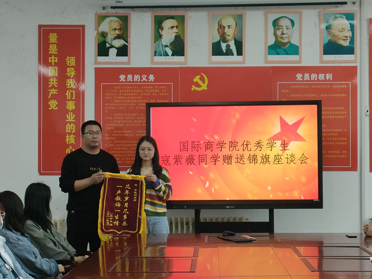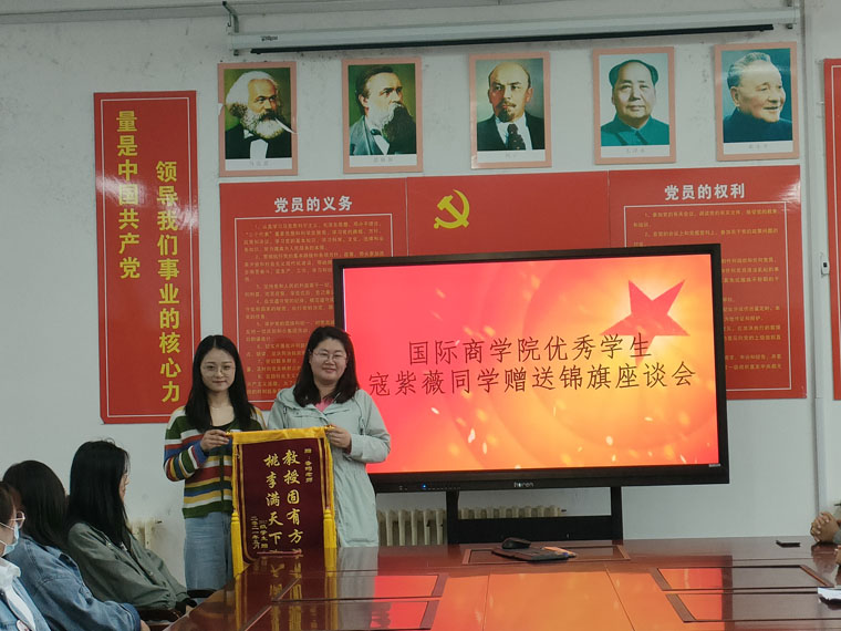 国际商学院2021届毕业生代表向学院捐赠礼物锦旗