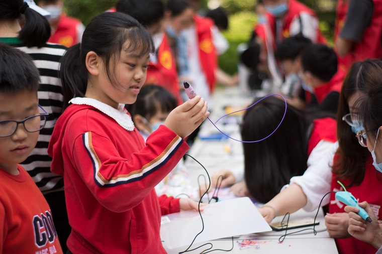 科普现场,社区人员络绎不绝。在做好防疫工作的前提下,各个年龄段的居民都来到现场,对3D打印产生了极大的兴趣。他们边问一些专业性的问题,一边尝试用打印笔打印物品,孩子们高兴地互相展示自己的作品,大人们沉浸在孩子们所散发的快乐之中。一位妈妈高兴的说:“你们是哪个学校的啊?太好了,以后要经常来搞搞这个活动啊,这东西,不光能让孩子学知识,还能帮我们看孩子,要不周末为了看这娃累坏了。在家光知道看电视,你看这多好啊!”哈哈的爽朗的笑声,回荡在活动现场。人群一直到中午我们收摊才逐渐散去。