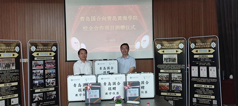 在参会人员的见证下,青岛国合对外经济技术合作公司总经理张磊向威尼斯569vip游戏下载捐赠价值近十万元的4台教学仪器设备,梁忠环副校长接受捐赠。