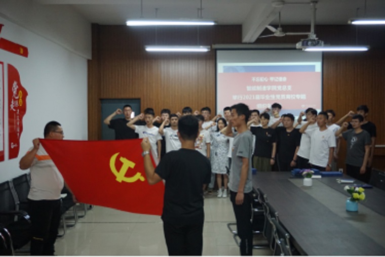 筚路蓝缕创伟业,不忘初心再启航。为庆祝中国共产党成立100周年,深入学习贯彻落实习近平总书记在党史学习教育动员大会上的重要讲话精神,广泛宣传党的光辉历程、伟大成就、优良传统,充分发挥基层党组织的战斗堡垒作用和党员的模范带头作用,6月29日下午,智能制造学院党总支组织开展“献礼百年华诞,我为党的生日送祝福”主题党日活动,通过举行“重温入党誓词”、“我为党的生日送祝福”、“我与党旗合个影”这些独具“仪式感”的表态等形式迎接党的百年华诞。