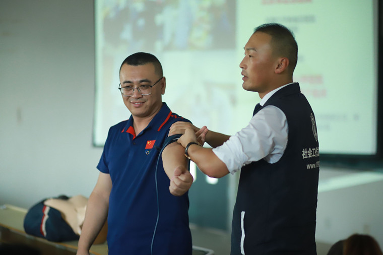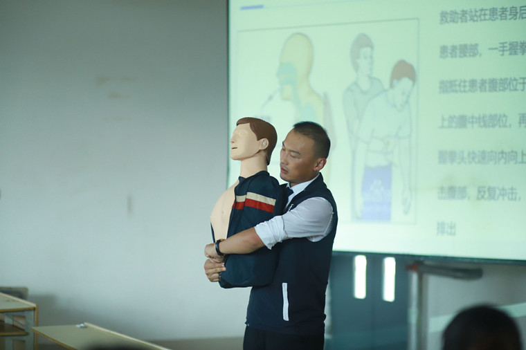 郝老师主要围绕四部分内容展开讲解。一是常态化防疫及校园内突发事故的应急处理方法,如噎食、晕厥休克、创伤出血、触电等应急处理方法;二是教职工常见共性职业病,如肩周炎,颈椎病,腰肌劳损,静脉曲张等;三是通过减盐,减油,减糖,健康口腔,健康体重,健康骨骼落实五大膳食调理;四是心梗,脑梗,冠心病等心脑血管疾病的防治。教师代表按照指导老师的讲解进行实操,发现日常生活中存在于自身和身边的很多安全隐患,掌握了最基础的紧急救护措施、常见职业病防治的相关常识。