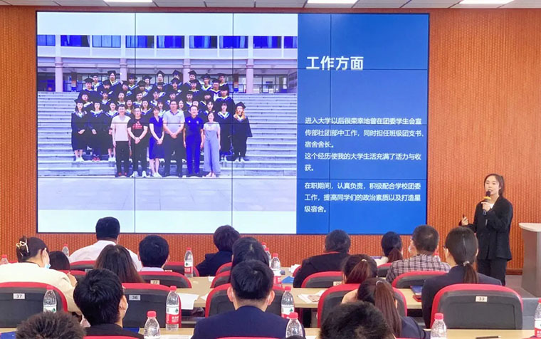 随后由16位候选人依次进行演讲,利用几分钟的时间将个人在思想、学习、社会实践、学科竞赛等方面的成绩和亮点进行展示,各班级100余名学生现场观摩。