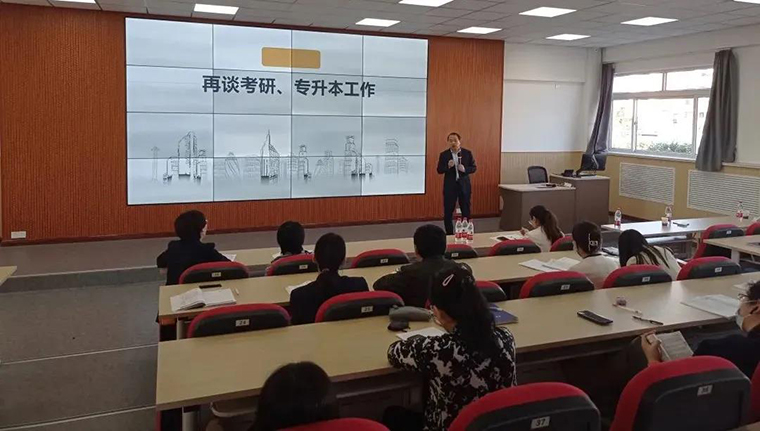 接下来,梁忠环副校长以《再谈考研、专升本工作》为题,为大家呈现了一场精彩的知识盛宴。梁校长用为什么抓升学率?抓升学率是否符合我国高等教育发展趋势?抓升学率的理论依据是什么?三个问题导入,引发大家对人才培养质量的思考。同时从社会发展趋势、高等教育发展方向、教育理论等多角度分析了二级学院作为基本的育人单位,更应该发挥主动性、能动性,为学生营造良好的学习氛围,教育青年学生现在不是躺平享乐的时候,应该走出舒适区,勇于挑战自我,追求卓越。