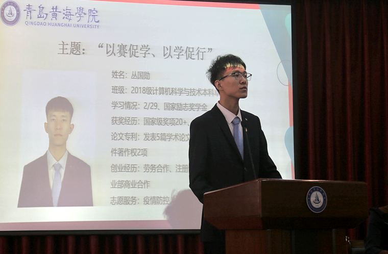以“以赛促学,以学促行”为发言主题,分享了个人从初入黄海以学长为榜样,在学科竞赛、第二课堂活动中从0到1,从1到很多,慢慢积累,逐步成长的过程。丛国勋同学作为大四在校生,截止目前累计发表国家级期刊论文5篇,获批授权实用新型专利2项,软件著作权2项;累计获得国家级奖项30余项,省级奖项30余项,院校级荣誉多项。他表示成绩的取得非一日之功,要敢于尝试、注重积累、永不放弃,并鼓励学弟学妹珍惜大学时光,积极拥抱学习,不畏艰险,迎难而战,勿负青春,勿负芳华。