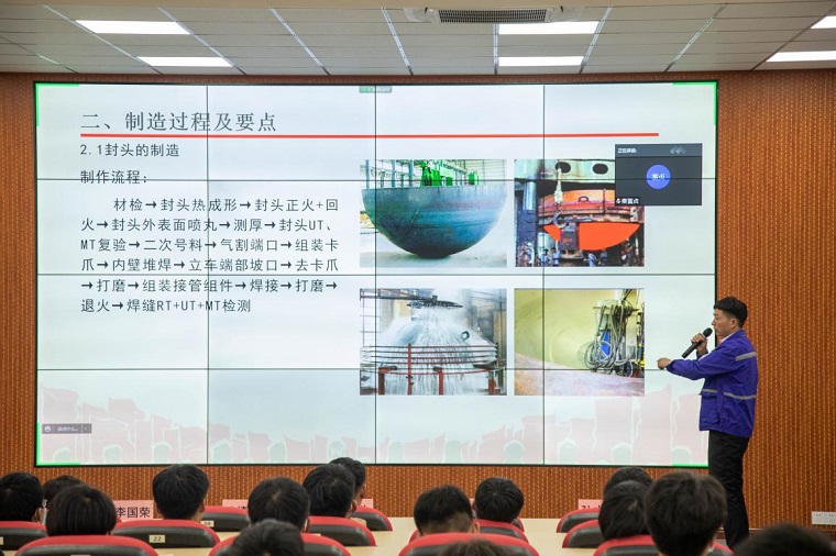 2011级校友-孙靖东,现为青岛兰石重型机械设备有限公司焊工高级技师,兰石集团焊接操作师,国家级技能大师工作室焊接负责人。多次荣获“甘肃省技术标兵”“甘肃省青年技术能手”“甘肃省技术能手”“青岛市劳动模范”“西海岸新区工匠”“西海岸金凤凰工匠”等荣誉称号。他带来“工业互联网下石油化工大型压力容器概述”的报告,报告从个人成长谈起,从所从事的焊接工作为例,详细介绍了加氢反应器、制造过程及要点、内件安装及要点、注意事项制造问题等精彩内容。