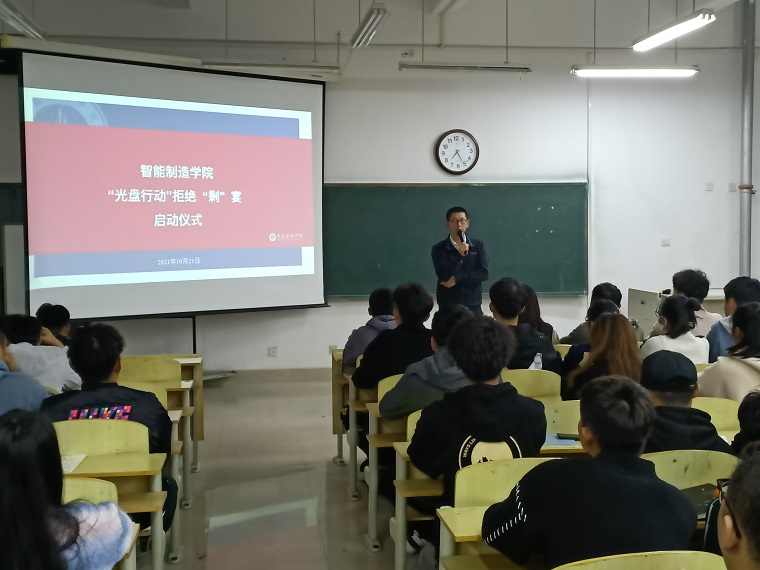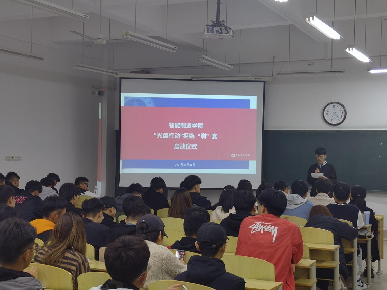 为弘扬勤俭节约的优良传统,响应号召、落实上级指示精神。10月21日晚,智能制造学院在知行楼206教室开展了“光盘行动”启动仪式。2020级及2021级全体班长与团支书参与此次仪式。