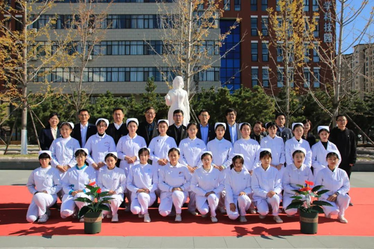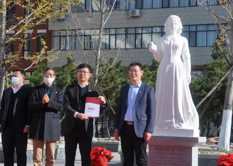随后,于福杰总经理、邹军晓副总经理、刘纪新校长助理、张玉根院长等与会领导共同为南丁格尔雕像落成揭幕。刘纪新校长助理代表学校向企业颁发捐赠证书。
