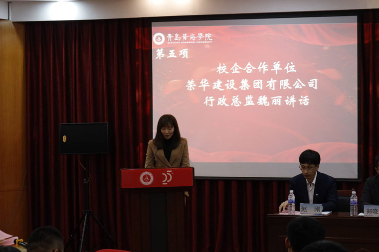 荣华建设集团有限公司行政总监魏丽致辞。魏丽总监首先祝贺已获奖的同学们,凭借自己辛勤努力最终取得优异的成绩。然后向在场人员介绍荣华建设集团近70年的发展历史、人才管理优势、以及所获得的多项奖项。魏总监表示,习近平总书记曾强调“青春因磨砺而精彩,人生因奋斗而升华”。因此,她希望同学们能够继续持之以恒,不断努力不断进步,以奋斗书写自己的人生。