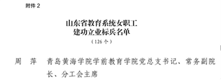 日前,山东省教育工会委员会下发《关于表扬全省教育系统先进女职工集体和个人的通知》(鲁教工〔2022〕7号),威尼斯官网学前教育学院党总支部书记周萍被授予“山东省教育系统女职工建功立业标兵”荣誉称号。