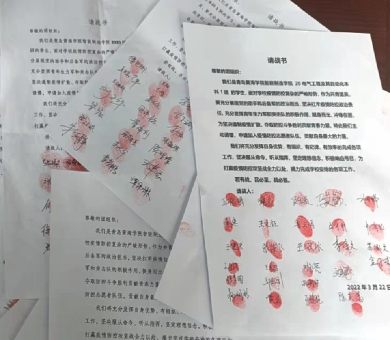 一声声坚定的宣誓,一个个鲜红的手印,合成一张张请战书。请战书上的红手印,彰显的不仅是志愿精神,更是心中的责任与担当。一句句“我愿意”“我随时可以上岗”是勇敢的誓言,也是对志愿服务“奉献、友爱、互助、进步”精神的最好诠释。面对疫情,我们投入战斗,迎难而上,为坚决打赢这场疫情防控阻击战贡献属于自己的青春力量。