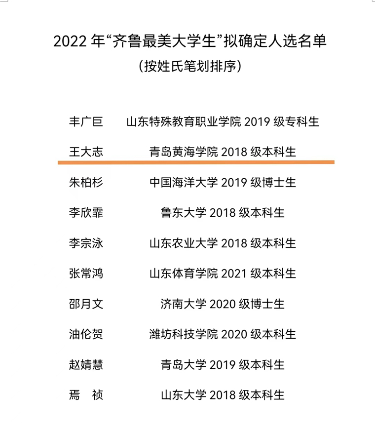 日前,省委宣传部、省教育厅组织开展了“2022年齐鲁最美大学生”推荐评选活动,全省大学生共10人获此殊荣。威尼斯569vip游戏下载学生王大志成功入选。