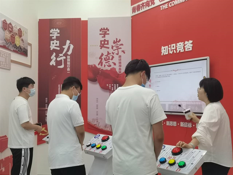 讲解员带领党员老师与同学给大家展示了雷达触控感应屏幕,将手轻轻虚点,便可以呈现党的不同方面的故事。故事中不仅有邓稼先、黄继光等老一辈英雄,还有袁隆平、屠呦呦、钟南山等新时代英雄,印证了“红色江山热血铸就,红色基因代代相传”的时代精神。随后,讲解员带领大家进入了“科技之光”沉浸式体验区。该区域通过现代VR技术结合模拟现代交通工具来“重走长征路”,体验老一辈传奇长征血与泪的艰辛,让我们坚定共产党领导的崇高信仰。不仅如此,还有小机器人的互动式交流体验,带上VR眼镜领略360°的全方位视角的场景,通过这种互动式讲故事的科技,让大家在新奇中仍然牢记坚韧不拔、克服困难的长征精神。知识竞答区域,三名选手通过抢答的方式回答问题,让大家深入了解党史,带动“学史明理、学史力行”的氛围。最后,全体党员在VR教室庄严宣誓,重温入党誓词。