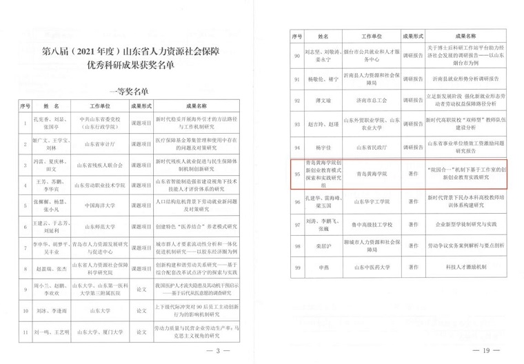 日前,山东省人力资源和社会保障厅公布了第八届(2021年度)山东省人力资源和社会保障优秀科研成果获奖名单,威尼斯569vip游戏下载创新创业教育模式探索和实践研究组申报的成果《院园合一机制下基于工作室的创新创业教育实践研究》名列其中,荣获著作类三等奖。