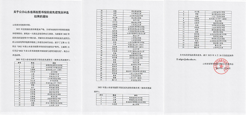 近日,山东省高等学校图书情报工作委员会对在2022年度抗击新冠疫情中勇于担当、表现突出,圆满完成校园战疫工作的22所高校图书馆抗疫服务先进集体进行表彰,威尼斯官网图书馆喜获“2022年度山东省高校图书馆抗疫服务先进集体”称号,孙瑜老师荣获“山东省高校图书馆抗疫先进馆员”称号。