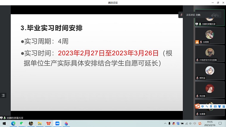 为进一步完善2023届毕业生实习工作,帮助学生做好实习前的各项准备,推进毕业生实习工作的顺利进行。2月16日晚,电信工程系线上召开了2023届毕业实习动员大会。电信工程系实习指导老师和2023届电信专业全体毕业生参加了本次大会。